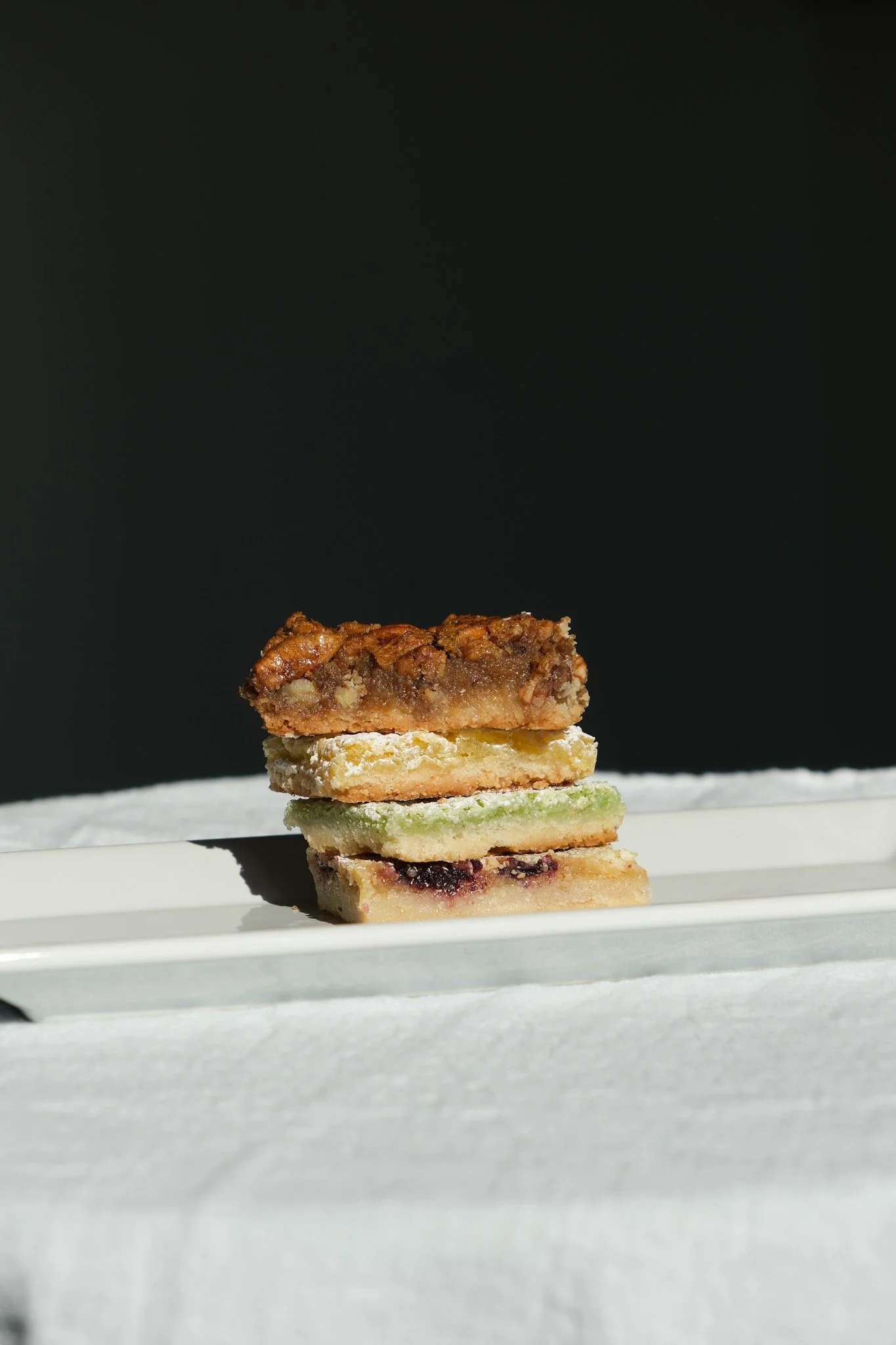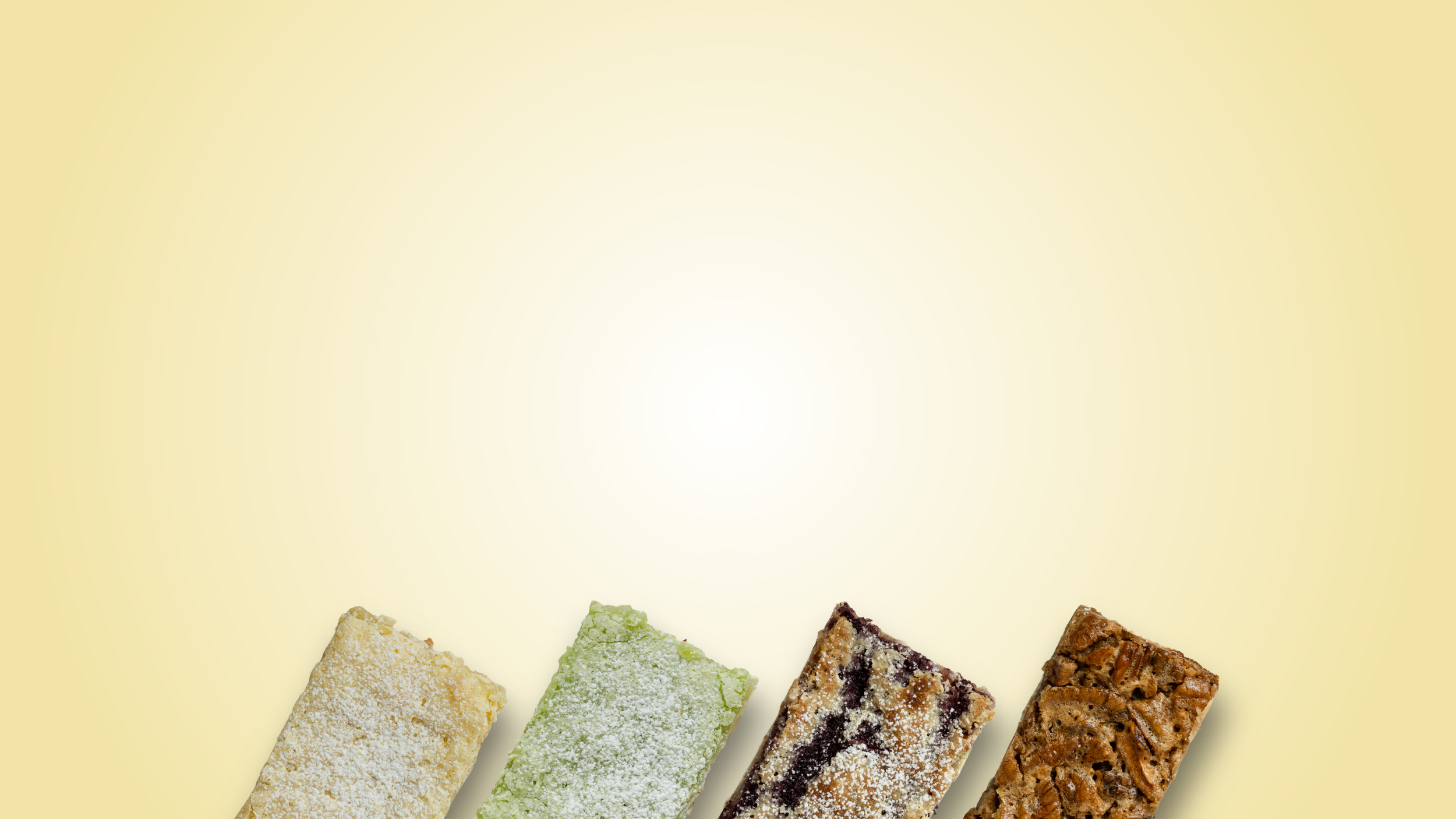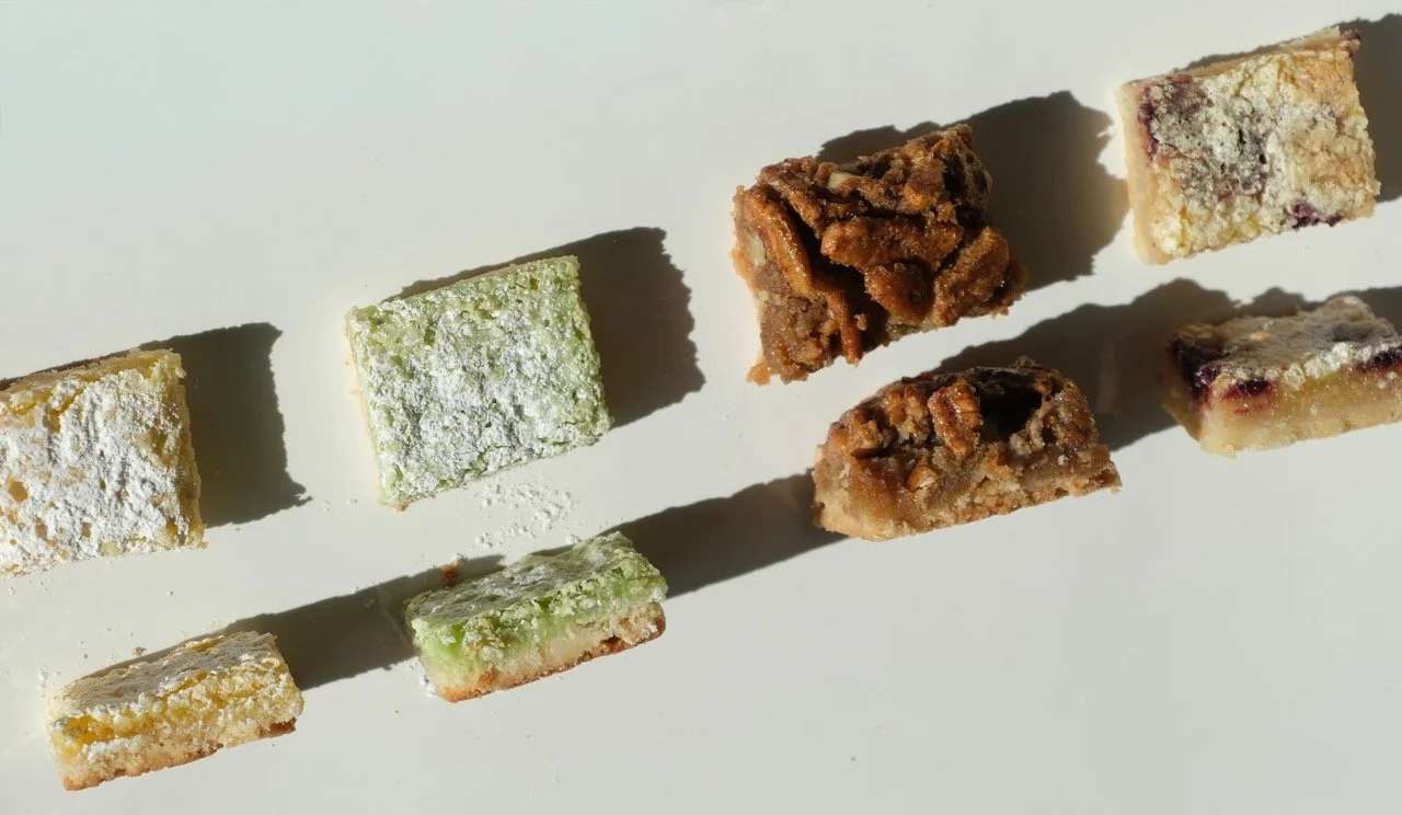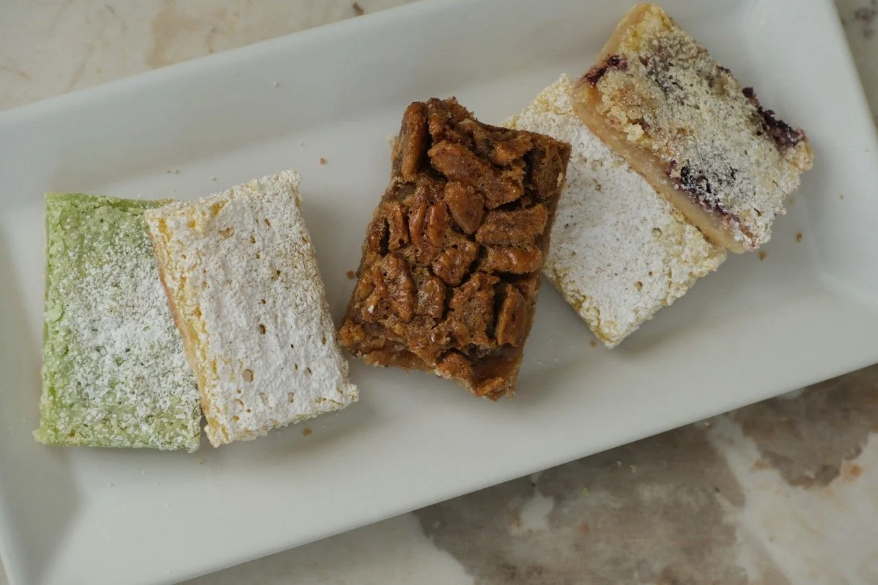 Our bars contain wheat, eggs, dairy, and tree nuts (pecans). Not all allergens are present in every product. Please consult us directly if you have any concerns about specific allergens before purchasing. Lemon Bars: flour, granulated sugar, butter, eggs, lemon juice, lemon zest, baking powder. Lemon Lime Bars: flour, granulated sugar, butter, eggs, lime juice, lime zest, lemon juice, lemon zest, baking powder. Lemon Berry Bars: flour, granulated sugar, butter, eggs, strawberries, blueberries, blackberries, raspberries, lemon juice, lemon zest, baking powder . Pecan Bars: pecans, flour, butter, brown sugar, eggs, corn syrup, granulated sugar, vanilla, salt. Contains: egg, wheat, tree nuts-pecans